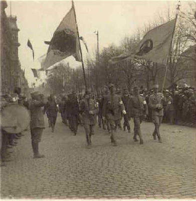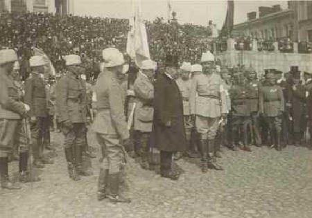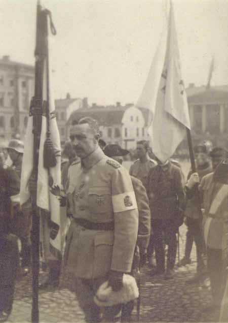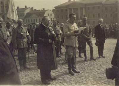 | Un Grand Défilé de la victoire fut organisé à Helsinki le 16 mai 1918 pour fêter la fin de la Guerre d'Indépendance. Ce défilé avait pour but politique essentiel de contrebalancer sur le plan national l'influence des troupes allemandes ayant reconquis Helsinki en avril, auxquelles les Blancs de la Finlande du Sud exprimaient une abondante reconnaissance. Le but était de montrer physiquement aux habitants de Helsinki les propres troupes militaires du pays. Mannerheim entendait par la même occasion rappeler que c'était cette propre armée qui avait réglé la guerre. |