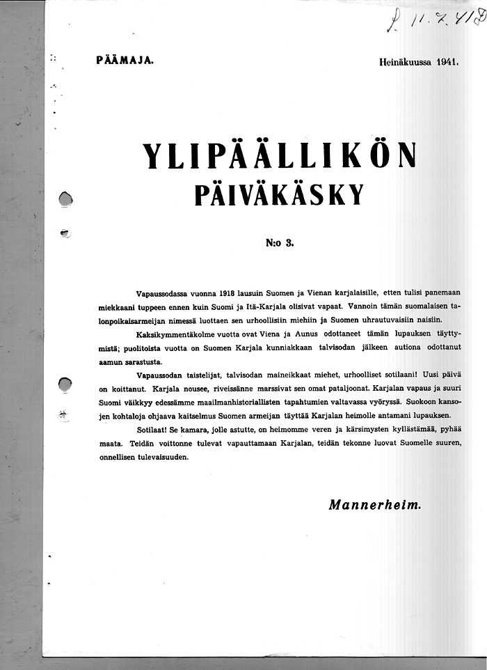 Order of the Day of the Sword Scabbard The proclamation was a source of inspiration to the friends of tribal ideals. A delegation from Joensuu and Sortavala managed to persuade both the Senate and the Commander-in-Chief to support their plan of sending out an expedition to liberate White Karelia. Mannerheim even went a step further and extended the plan to concern the Aunus district as well. On the other hand, the proclamation aroused criticism, concerning resources, which were considered insufficient, and the timing, which was thought to be inappopriate. The question of Eastern Karelia would be a political subject of dispute before the Finns would even have any real influence in the area. At the initial stages of the Continuation War, when an offensive of the Karelian army towards Lake Ladoga and the River Syväri was being prepared, Mannerheim issued the Order of the Day number 4 of the Commander-in-Chief, in which he referred to his promise of 1918, to expel the Bolsheviks out of Russian Karelia, to liberate the Karelian nations and to accord to Finland a great future. He said that the Karelians own battallions were marching in the ranks of the Finnish army, which was a reference to the so-called tribal battallions assembled in Finland. In Mannerheims view, his proclamation was in accordance with the ideas of the administration of the state, reflecting even a wider public opinion. This sort of an Order of the Day, in which aspirations for territorial expansion, for Great Finland, could be read in between the lines, aroused attention negative as well as positive among the political circles both in Finland and elsewhere in the world. The government, who found the proclamation too outspoken, tried to soften the tone by diplomatic means, although they never actually renounced its basic message. |