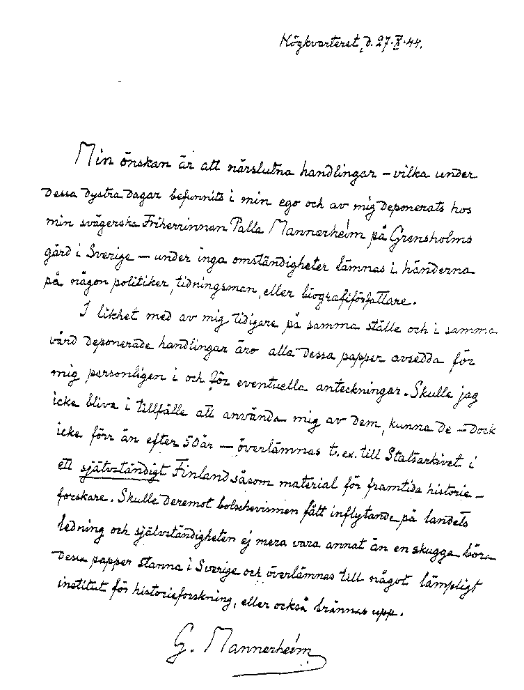 Vuonna 1941 Mannerheim toimitti osan yksityisarkistostaan turvaan Ruotsiin sukulaistensa luo ja syksyllä 1944 hän toimitti samaan paikkaan, Grensholmin kartanoon, uutta aineistoa. Lokakuun lopulla 1944 Liittoutuneiden (Neuvostoliiton) valvontakomissio sai Moskovassa ohjeet tiukentaa otettaan. Valvontakomissio oli toki alkujaankin esiintynyt vaativasti, kerännyt tietoja ja selvityksiä. Niskaan esikunnissa hengittäen neuvostoupseerit varmistivat suomalaisten saksalaisia vastaan käymän sodan tehostamista. Vaatimukseen liittyi uhkaus, että Neuvostoliiton sotilasjohto ryhtyy "asianomaisiin toimenpiteisiin". Juuri näitä "toimenpiteitä" Suomessa oli jo rauhantunnustelujen aikana pelätty. Oli tuntunut uhkarohkealta suostua armeijan kotiuttamiseen, kun epäonnistuminen muiden rauhanehtojen - mm. saksalaisten karkottamisen - täyttämisessä saattoi antaa voittajalle tekosyyn otteiden koventamiseen ja jopa maan miehittämiseen. Tuossa tilanteessa monet suomalaiset varautuivat pahimpaan, niin myös Suomen marsalkka Mannerheim. Hän päätti "näinä synkkinä aikoina" toimittaa valikoimiaan asiakirjoja Ruotsiin turvaan sinetöidyssä kangaskäärössä. Ne liittyvät Suomen poliittisiin ratkaisuihin, Saksan-suhteisiin ja Englannin-suhteisiin. Muita, kenties saman tyyppisiä asiakirjoja sisältäviä osia ylipäällikön ja päämajan arkistoista poltettiin samoihin aikoihin uuneissa Mikkelissä ja Helsingissä. Marsalkan sodanaikaisen vanhemman adjutantin Ragnar Grönvallin kertoman mukaan Mikkelin päämajan uunissa poltettiin mm. saksalaisten lähettämiä kirjeitä. Lähettäessään kangaskäärön Ruotsiin Mannerheim 27.10. 1944 määräsi, että se oli pidettävä sinetöitynä 50 vuoden ajan. Silloin se voitaisiin luovuttaa Suomen valtionarkistoon, mikäli Suomi olisi itsenäinen ja mikäli bolshevismi ei olisi saanut valtaa Suomen hallituksessa. Mikäli kommunismi olisi saanut vallan, paperien tuli jäädä Ruotsiin tai ne olisi poltettava. Vuoden 1991 syksyllä Neuvostoliitto lopetettiin ja Neuvostoliiton kommunistinen puolue lakkautettiin. Mannerheimin Ruotsiin tallettamat paperit voitiin 27.10. 1994 luovuttaa Suomen arkistolaitoksen hoidettavaksi.