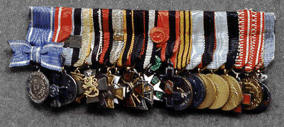 | 10. Pienoiskunniamerkkikiinnike, jossa seuraavat kunniamerkit 1. 1. luokan Vapaudenmitali ruusukenauhassa (1940) 2. Vapaudenristin 4. luokka miekkojen kera (1918) 3. Tampereen valtauksen kultainen ansiomitali ruusukenauhassa (1918) 4. Vilppulan risti 5. Raudun Risti 6. Suojeluskuntain kultainen ansioristi 7. Pyhän Yrjön Ritarikunta, IV luokka (1914) 8. Pyhän Wladimirin ritarikunta, IV luokka miekkojen kera (1905) 9. II luokan Rautaristi (1918) 10. Kunnialegioonan Upseeriristi (1912) 11. Liettuan Vyties-Kruziaus Sotilasristin kunniamerkin II luokka, 2. arvo (1933) 12. Venäläis-japanilaisen sodan 1904-1905 muistomitali (1905) 13. Nikolai II:n kruunajaisten muistomitali (1896) 14. Vuoden 1812 Isänmaallisen sodan 100-vuotis muistomitali (1913) 15. Vuonna 1709 käydyn Poltavan taistelun 200-vuotis muistomitali (1909) 16. Romanov-suvun 300-vuotisen hallituskauden juhlamuistomitali 17. Suomen Punaisen Ristin ansioristi 18. Suomen Punaisen Ristin pronssinen ansiomitali 19. Ruotsin Punaisen Ristin kultainen kunniamerkki |